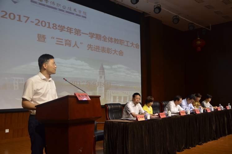 9月8日下午,我校隆重召开2017-2018学年第一学期全体教职工大会暨“三育人”先进表彰会,热烈庆祝第三十三个教师节。董事长严健军、校长陈晓斌、党委书记陈俊傲等学校领导参加大会,会议由陈俊傲书记主持。