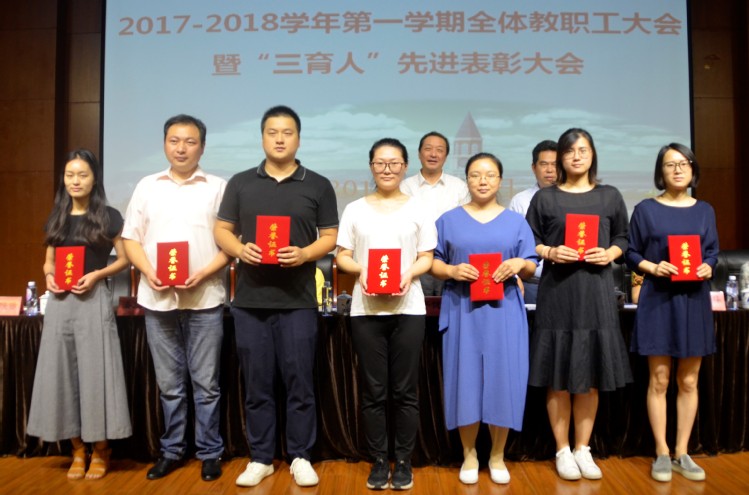 会上,周珍珠、张炳达、蒋成浩、蓝花红、王园、顾卫慧、王琳艳、陈艳、于建云、杨莉、闫萍、王玉荣、孙均海、莫夏瑾、单驹超、夏斌和王诚晓17名教职工获得“三育人”表彰。