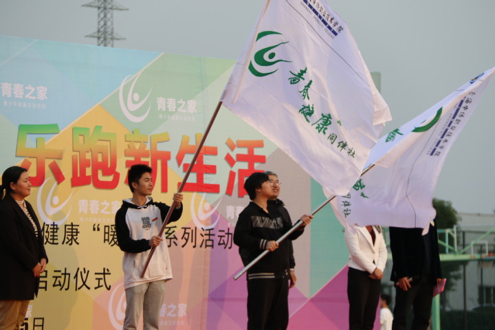 蒋成浩处长提议每天跑步2公里,共同营造“热爱运动,热爱健康,热爱生命”的校园氛围;徐邑副镇长鼓励青年学生积极参与运动和公益活动;周永立副秘书长和陈小丽副主任为“青春健康同伴社”授旗,鼓励他们为“青春健康”领跑。
